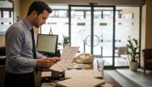 • Ein Hotelmanager überprüft am Empfang die aktuellen Sicherheitsunterlagen.