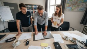 • Der Hoteldirektor bespricht sich gemeinsam mit seinem Team im Büro.